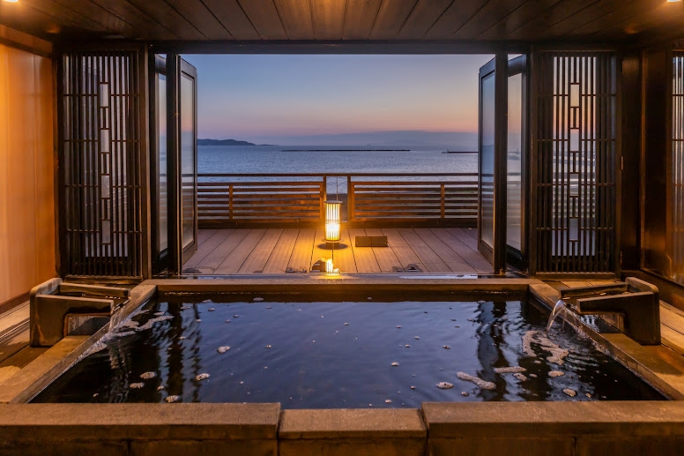 • 海を望む絶景露天風呂: 鏡ヶ浦の絶景を望む貸切露天風呂で、心ゆくまでリラックスできます。