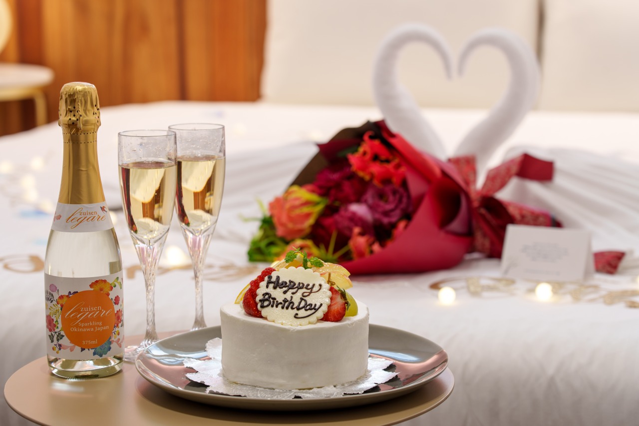 •華やかな装飾: お部屋のバルーン装飾やメッセージカード、スペシャルケーキも手配可能!