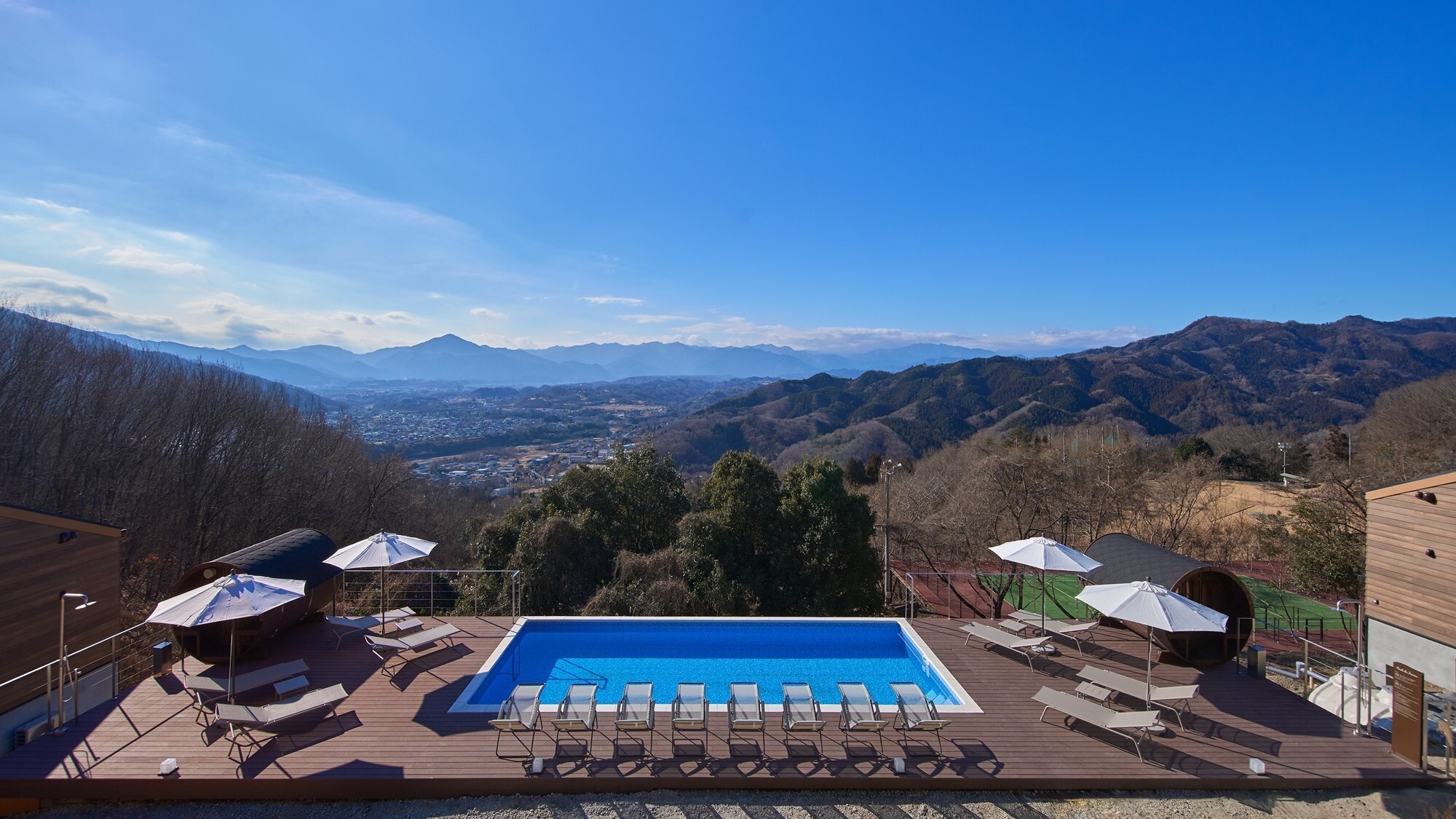 秩父の自然に囲まれたコテージタイプの宿で、季節営業の屋外プールとサウナを楽しめるスタイル。大規模レジャープールのような混雑とは無縁で、静かな景色の中で、家族のペースでゆっくりと水遊びを楽しめます。